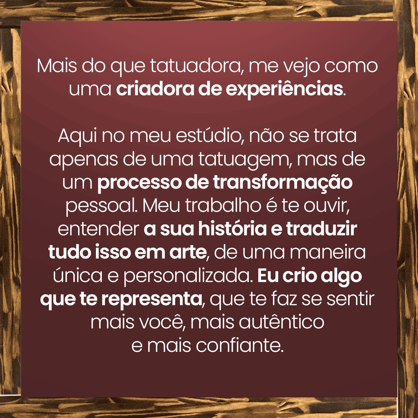 Se você está pronto para viver uma experiência única, se permita esse momento. Aqui, cada tatuagem é uma oportunidade de se conectar com a sua essência, de se empoderar, de celebrar quem você é!